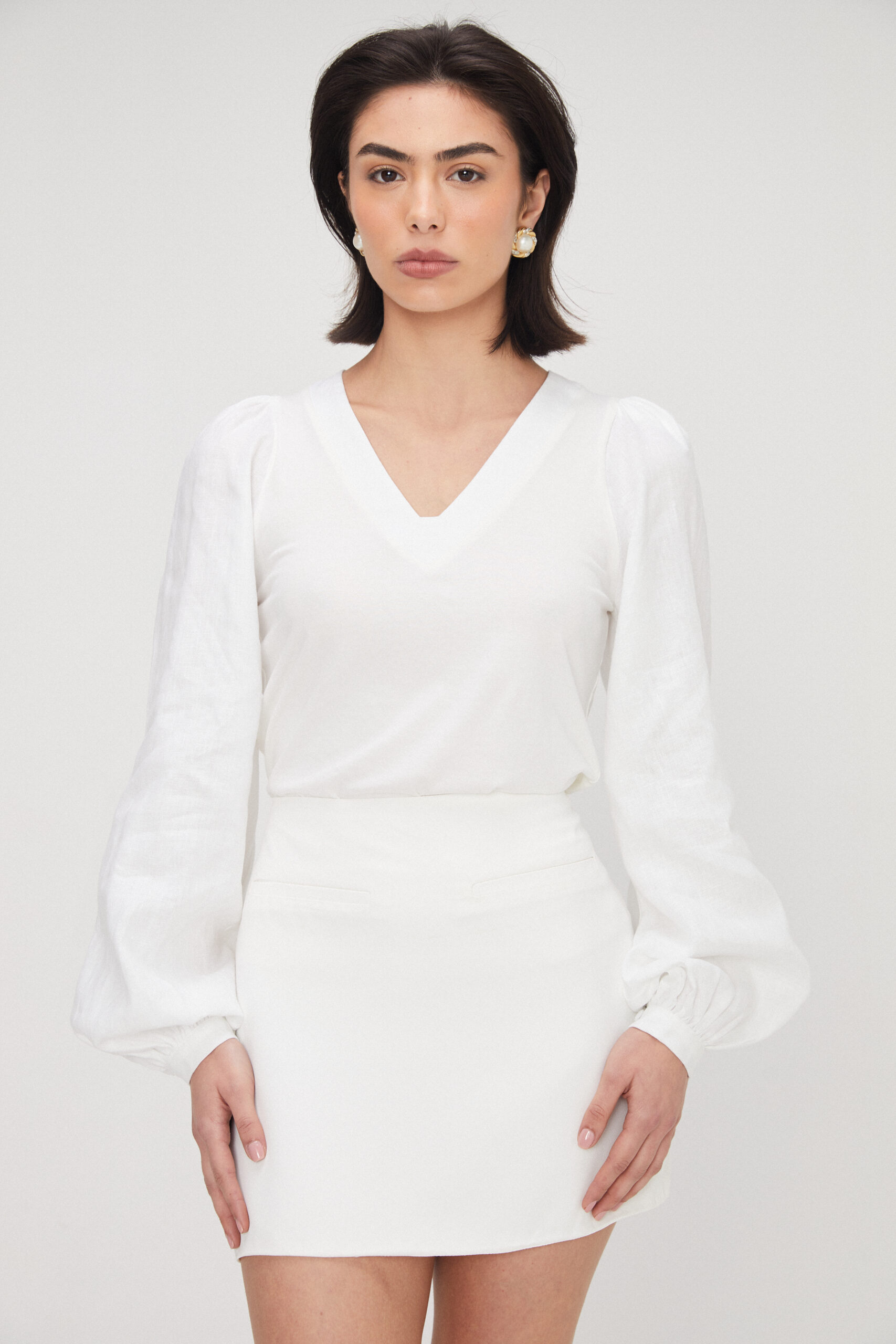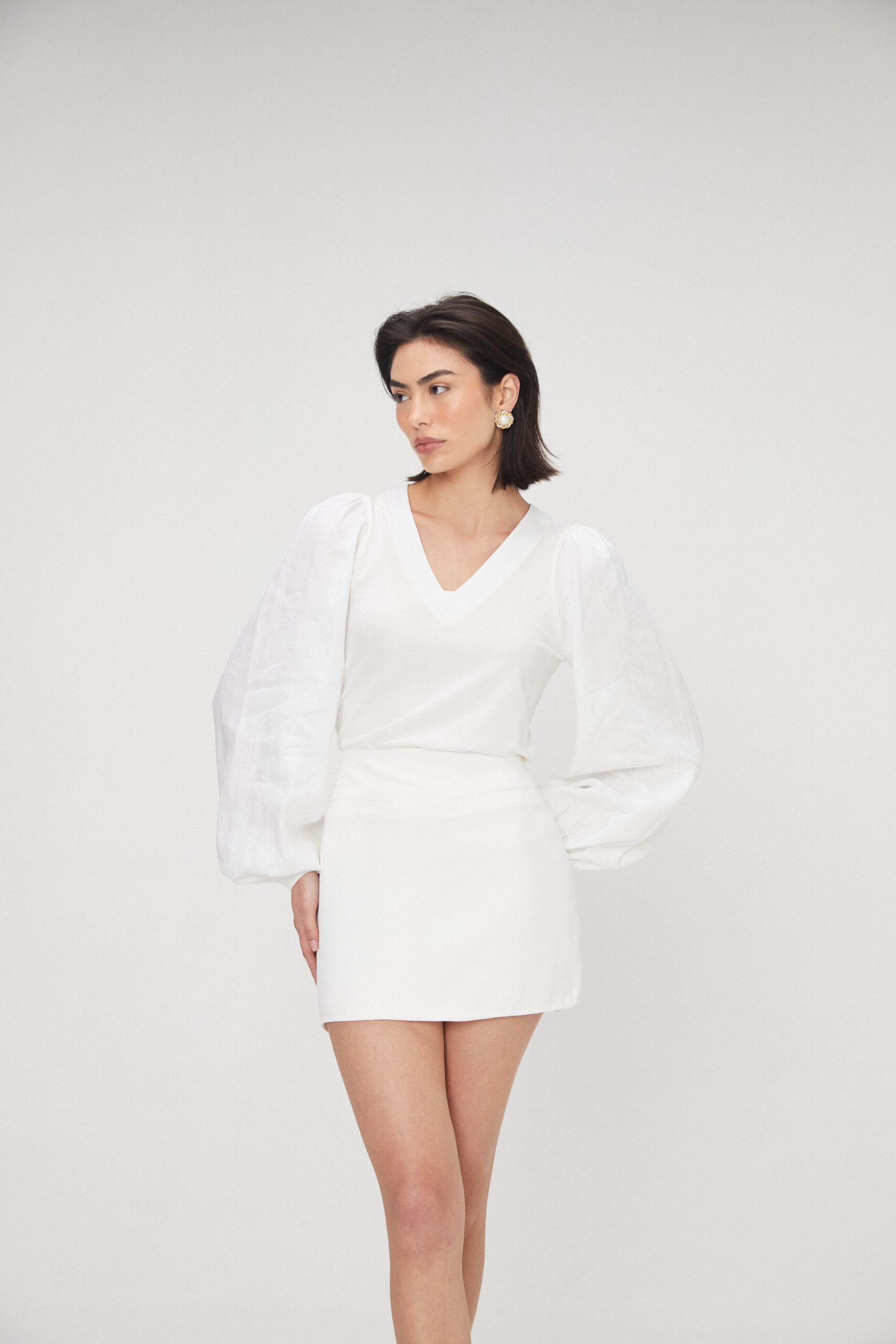 A Blusa Balonê combina o corpo em malha de algodão egípcio com mangas bufantes e gola em 100% linho, criando contraste entre texturas e volumes. Os punhos são finalizados com abotoamento em botão forrado, com um acabamento delicado. Uma peça que une conforto e sofisticação.